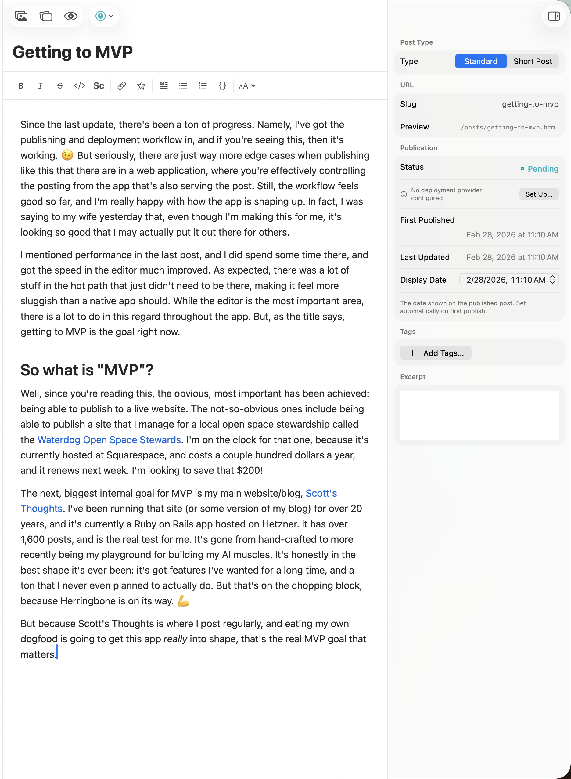 Progress ReportSince the last update, there's been a ton of progress. Namely, I've got the publishing and deployment workflow in, and if you're seeing this, then it's working. 😉 But seriously, there are just way more edge cases when publishing like this than there are in a web application, where you're effectively controlling the posting from the app that's also serving the post. Still, the workflow feels good so far, and I'm really happy with how the app is shaping up. In fact, I was saying to my wife yesterday that, even though I'm making this for me, it's looking so good that I may actually put it out there for others.
